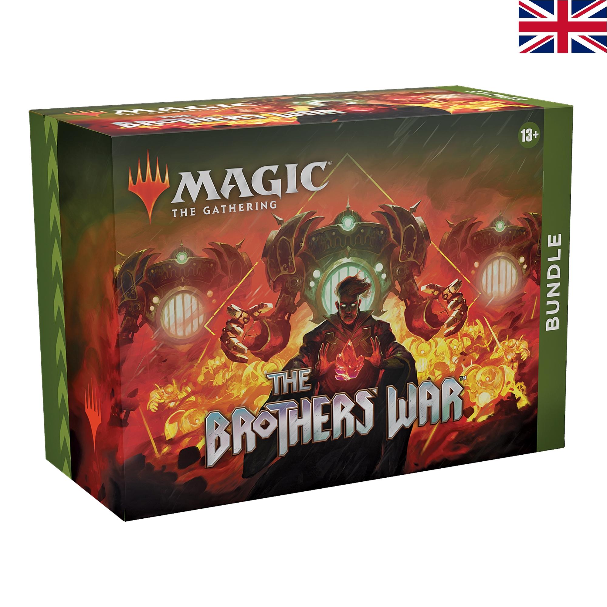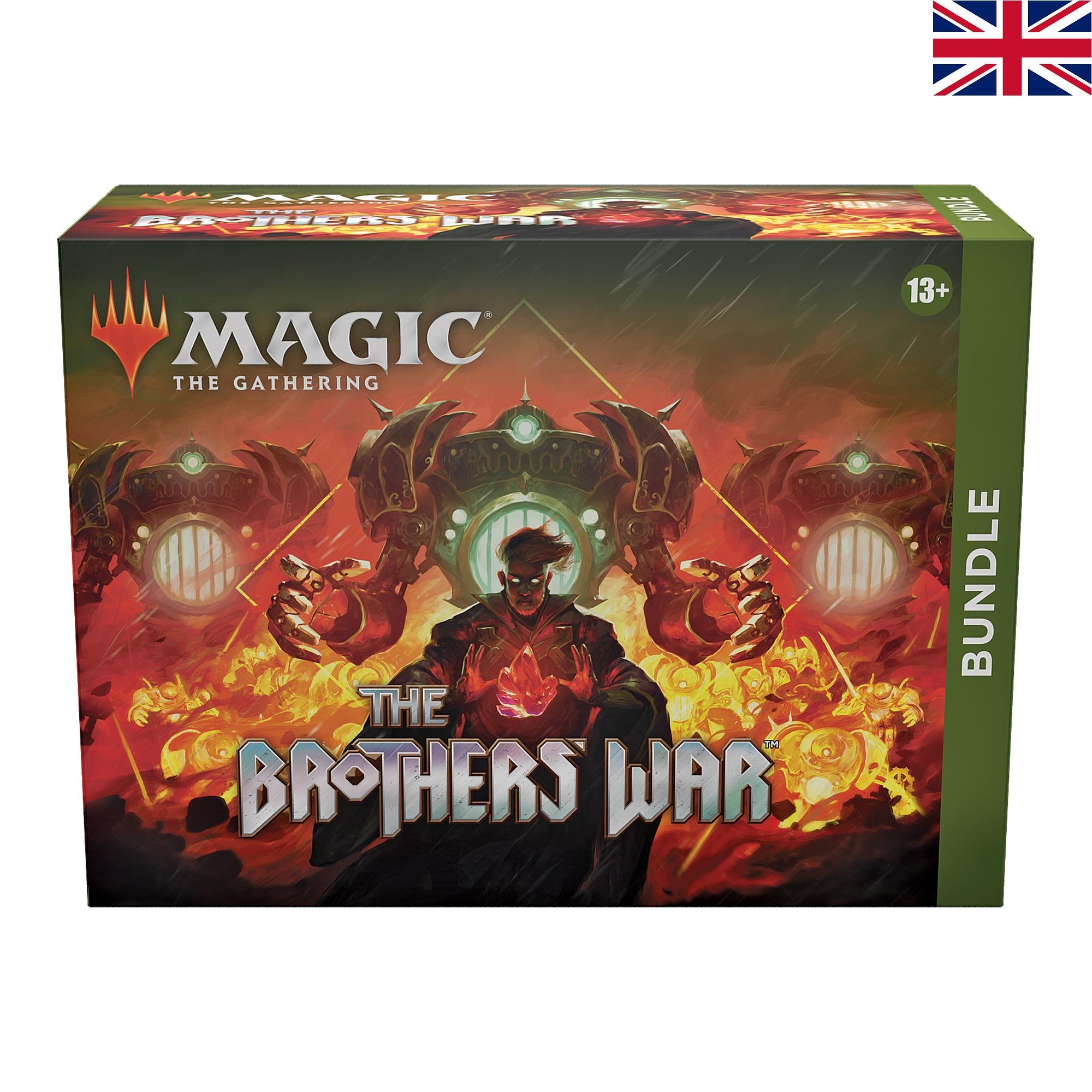 The Brothers’ War Bundle contains 8 The Brothers’ War Set Boosters—the best boosters to open just for fun—plus exclusive accessories, with 40 basic lands (20 traditional foils and 20 nonfoils), 1 Traditional Foil promo card with Bundle-exclusive alternate art, 1 oversized Spindown life counter (red or green), 1 card storage box, and 2 reference cards.